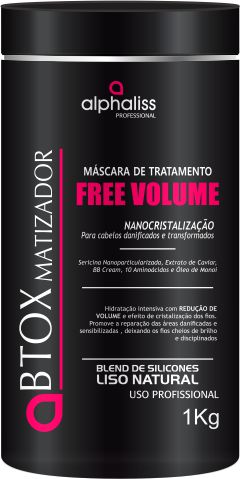 O Botox Matizador Free Volume AlphaLiss age direto no córtex do fio uniformizando a espessura das raízes às pontas, eliminando o volume, o ressecamento e as pontas ásperas, recuperando o peso e o balanço dos fios. A Sericina Nanoparticularizada (extraída do casulo do bicho da seda) é uma molécula elástica de alta afinidade com a queratina natural do cabelo humano, pois se liga fortemente a ela, agindo como um adesivo que repara, e cimenta as cutículas danificadas e mantendo os fios alinhados. O resultado é uma superfície uniforme e uma distribuição perfeita de proteínas nos fios, que se tornam muito mais brilhantes, com balanço natural e macios ao toque.
